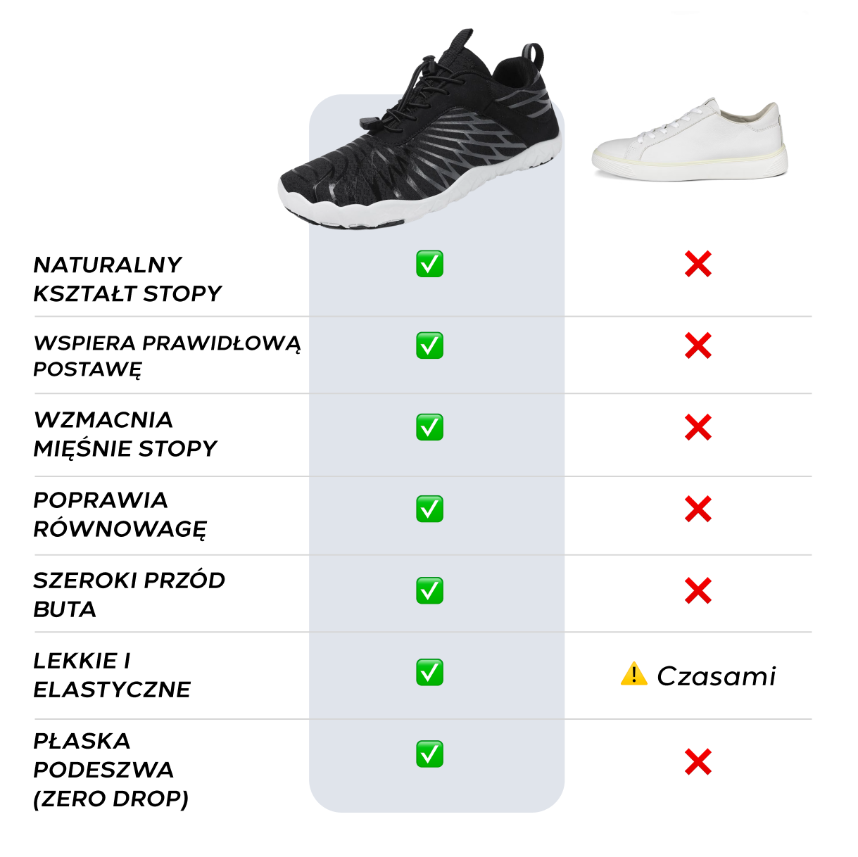 Twarde, nieruchome podeszwy i niewygodne obuwie uniemożliwiają naturalny, anatomiczny ruch podczas codziennych czynności. Może to powodować bolesne objawy w układzie mięśniowo-szkieletowym.